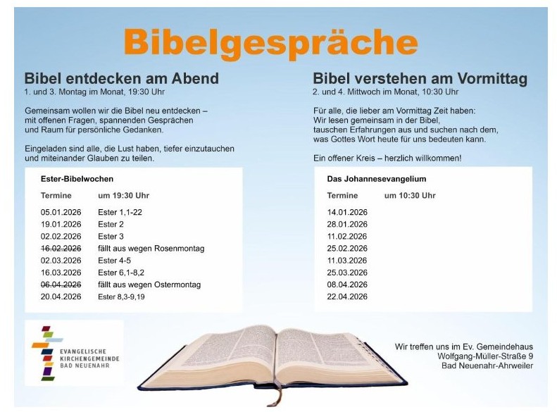 Die Bibelgespräche gehen weiter am 14.01.2026 vormittags und am 19.01.2026 um 19.30 Uhr - je nachdem wie es Ihnen passt.
